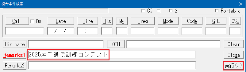 3) 複合条件検索の画面が開きますのでRemarks1欄に「2025岩手通信訓練コンテスト」と入力して、