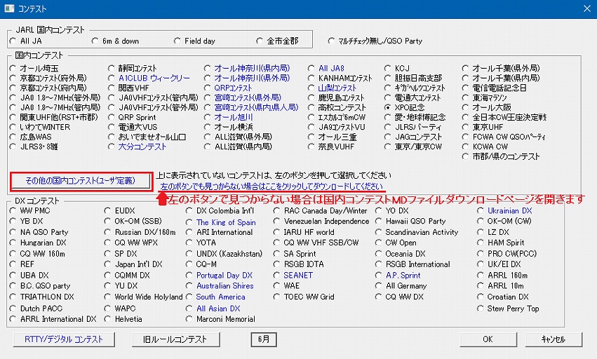 ・ ユーザ定義ファイル一覧にコンテストが見つからない場合は、コンテスト選択画面の中ほどの青色文字表示の 「左のボタンでも見つからない場合にはここをクリックしてダウンロードしてください」をクリックすると、 CTESTWINマルチチェック用国内コンテスト MDファイルダウンロードページ が開きます ので、ここから ダウンロードしてください。
